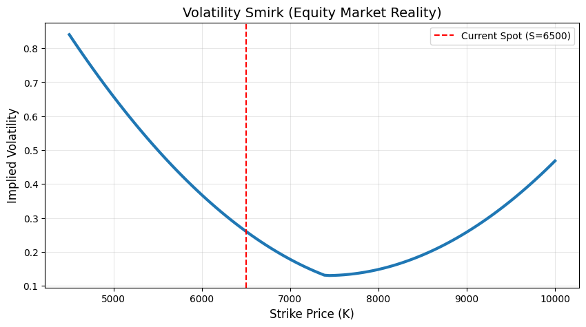When we plot the Implied Volatility (IV) against the Strike Price (K), we don’t see the flat line that classic theory predicts. Instead, we see a lopsided “U” shape: